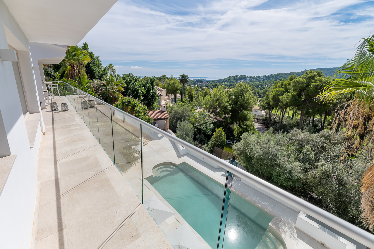 Willkommen in dieser kürzlich vollumfänglich renovierte Villa, die mit einer großzügigen Wohnfläche von 537 m² auf einem Grundstück von 1.854 m² thront. Angrenzend befindet sich der äußerst gepflegte Golfplatz von Son Vida. Die Villa erstreckt sich über drei Ebenen und bietet fünf Schlafzimmer und vier Bäder. Die moderne Küche öffnet sich zu einem Wohn-Esszimmer-Bereich mit offenen, hellen Räumen und eingelassener Beleuchtung. Diese Immobilie eröffnet nicht nur einen malerischen seitlichen Meerblick, sondern entfaltet auch ein beeindruckendes Bergpanorama. In perfekter Südwestlage gelegen genießt man hier alljährliche Sonne. Der Außenbereich umfasst mehrere Terrassen, einige überdacht, die auf einen gepflegten mediterranen Garten mit Salzwasserswimmingpool blicken. Die stilvoll integrierte Außenküche rundet dieses Angebot ab. Weitere Ausstattungsmerkmale sind: Ein Doppelcarport, Fußbodenheizung und Klimaanlage.