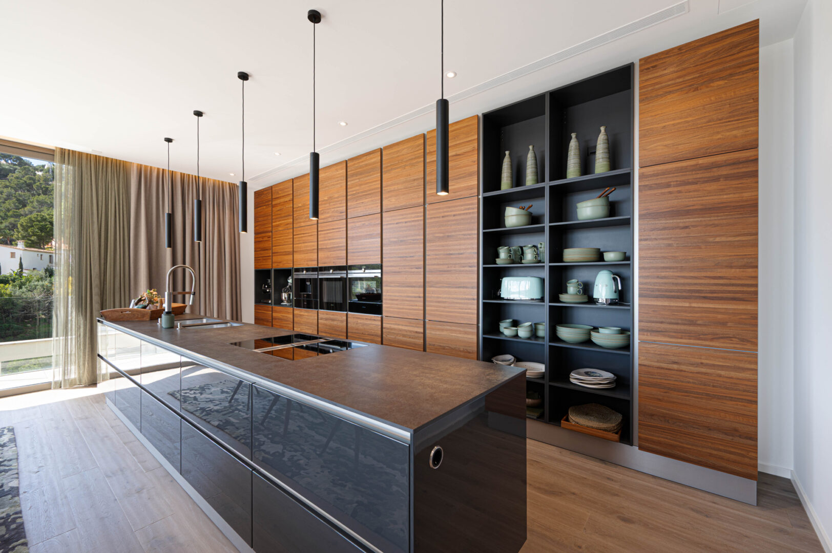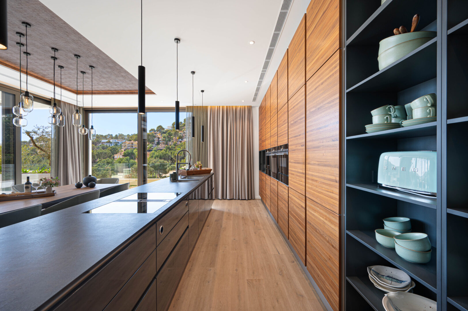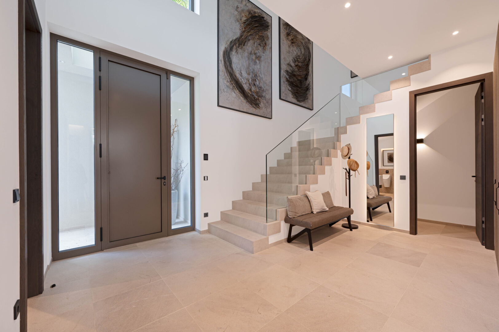 In einer der begehrtesten Wohnlagen von Can Borras präsentiert sich diese außergewöhnliche Neubauvilla als modernes Refugium für anspruchsvolles Wohnen. Hier vereinen sich zeitgenössisches Design, mediterrane Wohnkultur und ein hoher Qualitätsanspruch zu einem harmonischen Gesamtkonzept. Die Immobilie wurde von erfahrenen Handwerksbetrieben mit viel Liebe zum Detail umgesetzt und strahlt eine zeitlose Eleganz aus. Natürliche Materialien, erstklassige Schreinerarbeiten und fein abgestimmte Farbtöne verleihen jedem Raum eine besondere Atmosphäre. Der offen konzipierte Wohn-, Ess- und Küchenbereich bildet das Zentrum des Hauses. Großflächige Schiebetüren lassen sich weit öffnen und verlängern den Wohnraum nahtlos auf die Terrassen und in den Außenbereich. Die hochwertige Küche der Marke Next125, ausgestattet mit Premiumgeräten von Siemens, Bora und Blanco, fügt sich stilvoll in das Gesamtbild ein. Die Villa verfügt über insgesamt fünf Schlafzimmer, darunter ein separater Gästebereich mit eigenem Wohnraum. Jedes Zimmer ist mit einem Bad en suite versehen und gewährleistet damit ein hohes Maß an Privatsphäre. Die klare Architektur, lichtdurchflutete Räume und sorgfältig ausgewählte Oberflächen schaffen eine ruhige, exklusive Wohnatmosphäre. Ein privater Fitnessraum, eine Doppelgarage sowie ein Aufzug, der vom Untergeschoss bis zur großen Dachterrasse führt, bieten zusätzlichen Komfort. Ein Infinity-Pool mit angrenzender Umkleide und Dusche setzt einen eindrucksvollen Akzent und ergänzt das luxuriöse Gesamterlebnis. Besonders hervorzuheben ist die weitläufige Dachterrasse mit integrierter Außenküche – ein idealer Ort, um den Blick über den Hafen, die Küste und das offene Meer zu genießen. Der mediterran gestaltete Garten mit Olivenbäumen, Lavendel und Palmen rundet das Bild dieser außergewöhnlichen Villa harmonisch ab. Zur hochwertigen Ausstattung gehören unter anderem Naturstein aus Mallorca, edle Eichendielen, moderne Bäder, ein umfassendes Smart-Home-System, Fußbodenheizung, Klimaanlage, elektrische Beschattung sowie ein Sicherheits- und Insektenschutzkonzept.