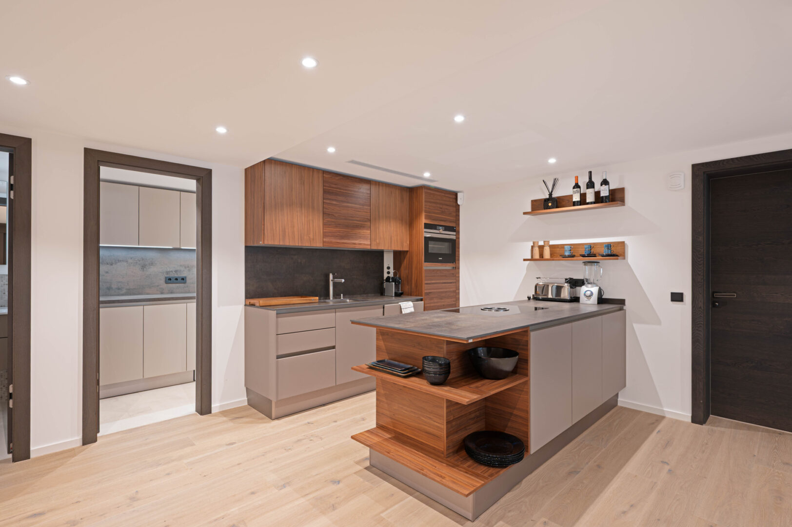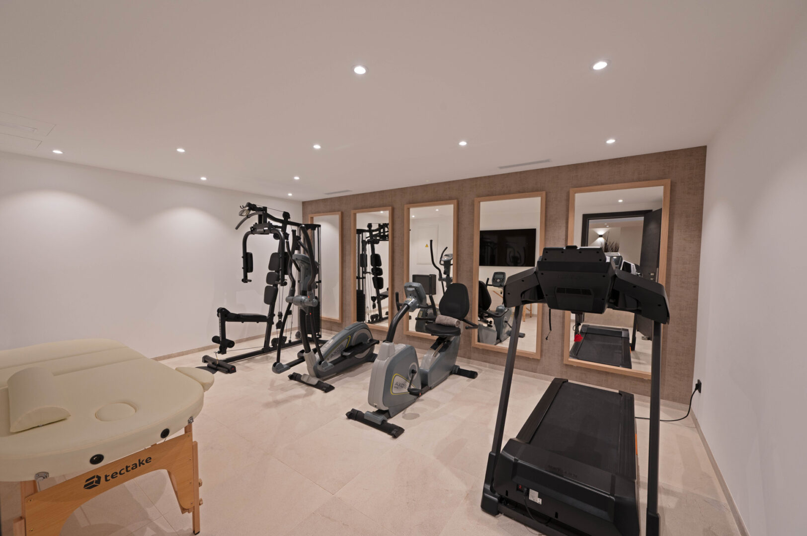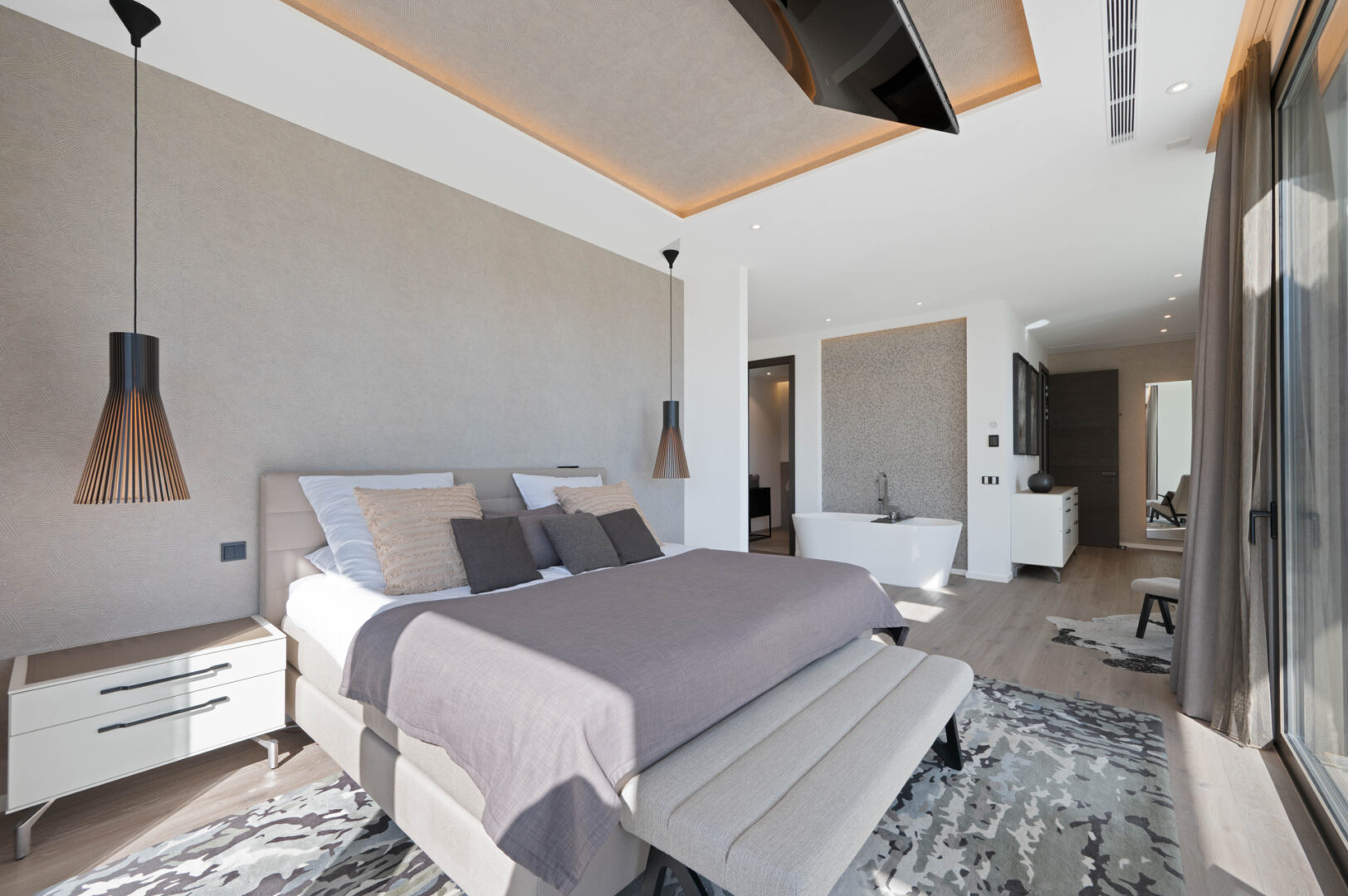In einer der begehrtesten Wohnlagen von Can Borras präsentiert sich diese außergewöhnliche Neubauvilla als modernes Refugium für anspruchsvolles Wohnen. Hier vereinen sich zeitgenössisches Design, mediterrane Wohnkultur und ein hoher Qualitätsanspruch zu einem harmonischen Gesamtkonzept. Die Immobilie wurde von erfahrenen Handwerksbetrieben mit viel Liebe zum Detail umgesetzt und strahlt eine zeitlose Eleganz aus. Natürliche Materialien, erstklassige Schreinerarbeiten und fein abgestimmte Farbtöne verleihen jedem Raum eine besondere Atmosphäre. Der offen konzipierte Wohn-, Ess- und Küchenbereich bildet das Zentrum des Hauses. Großflächige Schiebetüren lassen sich weit öffnen und verlängern den Wohnraum nahtlos auf die Terrassen und in den Außenbereich. Die hochwertige Küche der Marke Next125, ausgestattet mit Premiumgeräten von Siemens, Bora und Blanco, fügt sich stilvoll in das Gesamtbild ein. Die Villa verfügt über insgesamt fünf Schlafzimmer, darunter ein separater Gästebereich mit eigenem Wohnraum. Jedes Zimmer ist mit einem Bad en suite versehen und gewährleistet damit ein hohes Maß an Privatsphäre. Die klare Architektur, lichtdurchflutete Räume und sorgfältig ausgewählte Oberflächen schaffen eine ruhige, exklusive Wohnatmosphäre. Ein privater Fitnessraum, eine Doppelgarage sowie ein Aufzug, der vom Untergeschoss bis zur großen Dachterrasse führt, bieten zusätzlichen Komfort. Ein Infinity-Pool mit angrenzender Umkleide und Dusche setzt einen eindrucksvollen Akzent und ergänzt das luxuriöse Gesamterlebnis. Besonders hervorzuheben ist die weitläufige Dachterrasse mit integrierter Außenküche – ein idealer Ort, um den Blick über den Hafen, die Küste und das offene Meer zu genießen. Der mediterran gestaltete Garten mit Olivenbäumen, Lavendel und Palmen rundet das Bild dieser außergewöhnlichen Villa harmonisch ab. Zur hochwertigen Ausstattung gehören unter anderem Naturstein aus Mallorca, edle Eichendielen, moderne Bäder, ein umfassendes Smart-Home-System, Fußbodenheizung, Klimaanlage, elektrische Beschattung sowie ein Sicherheits- und Insektenschutzkonzept.