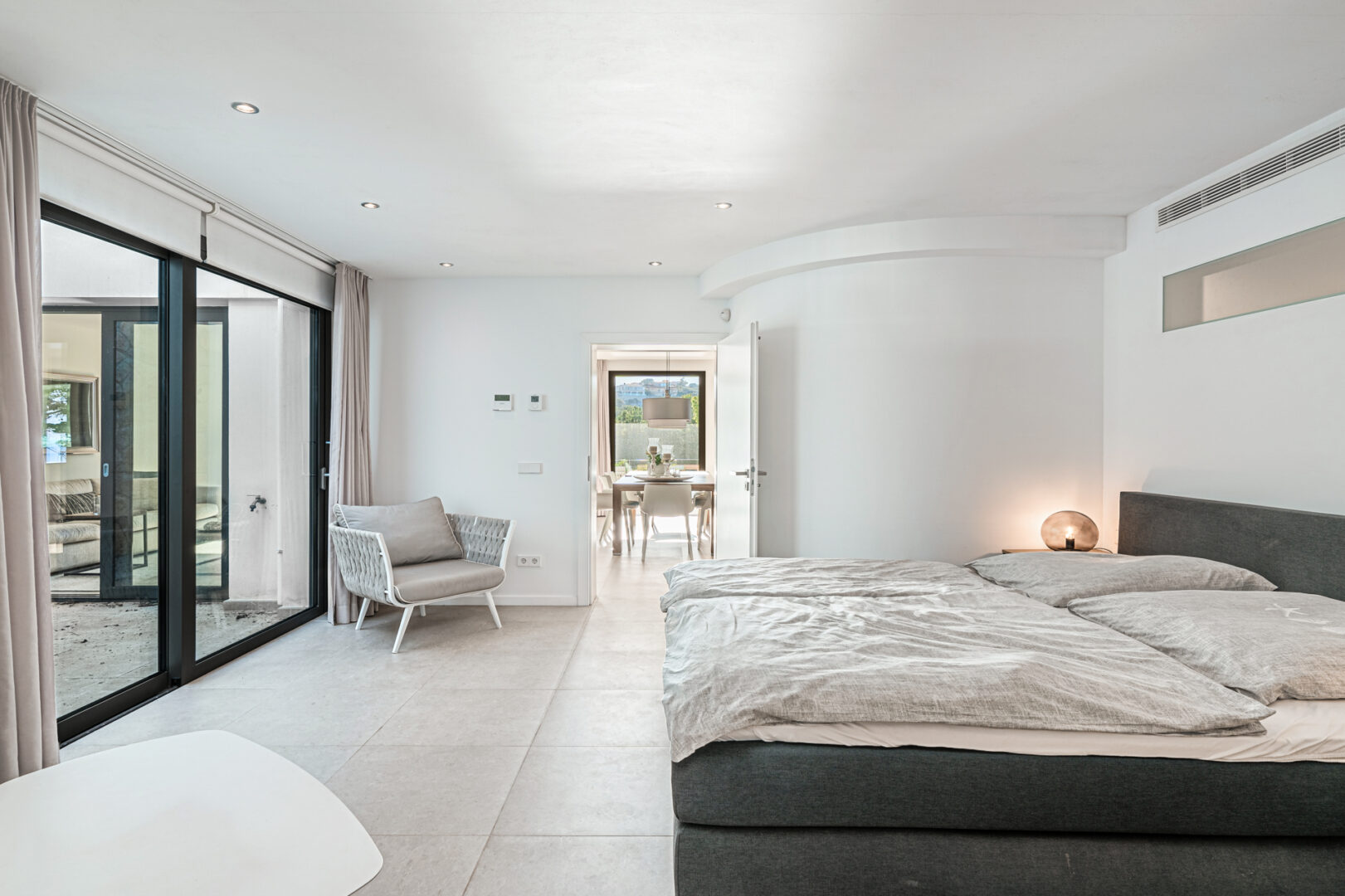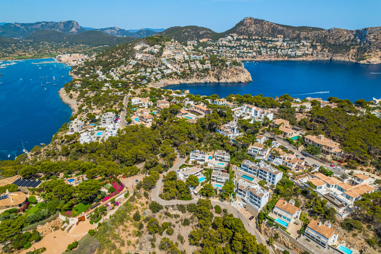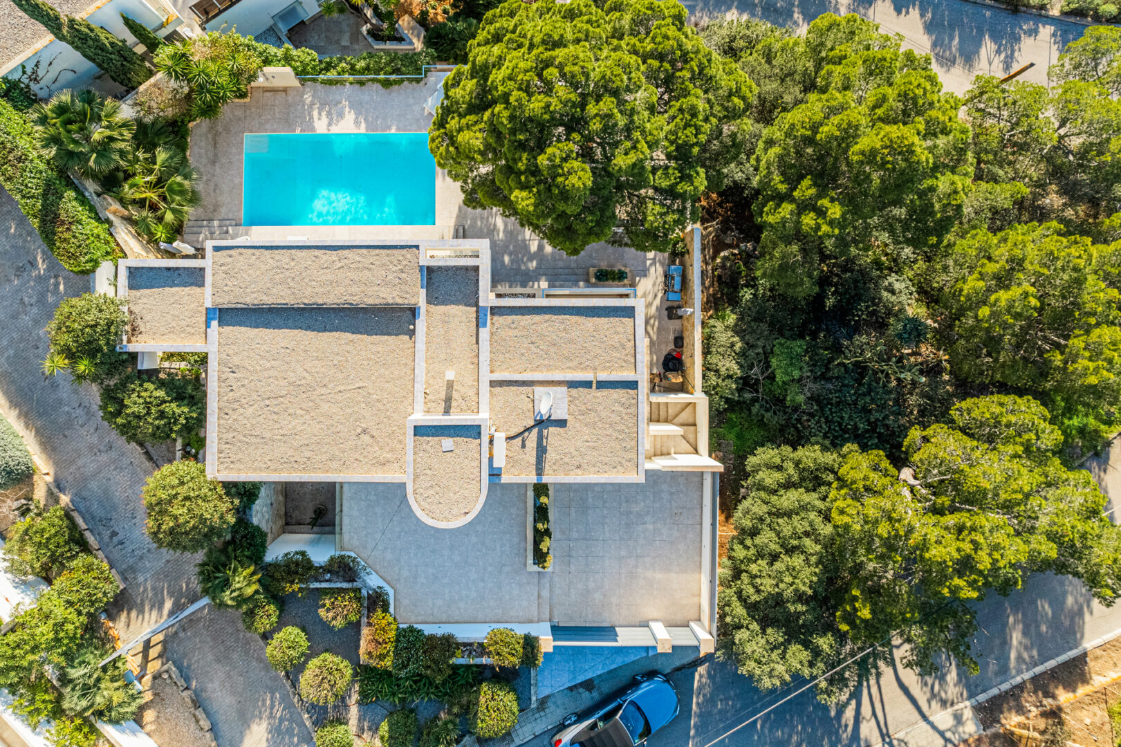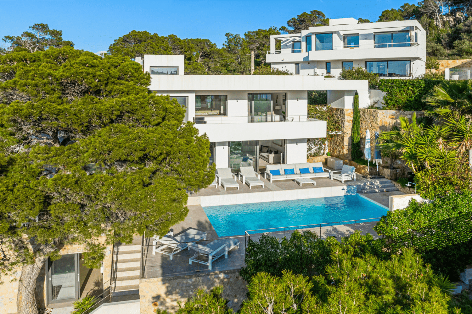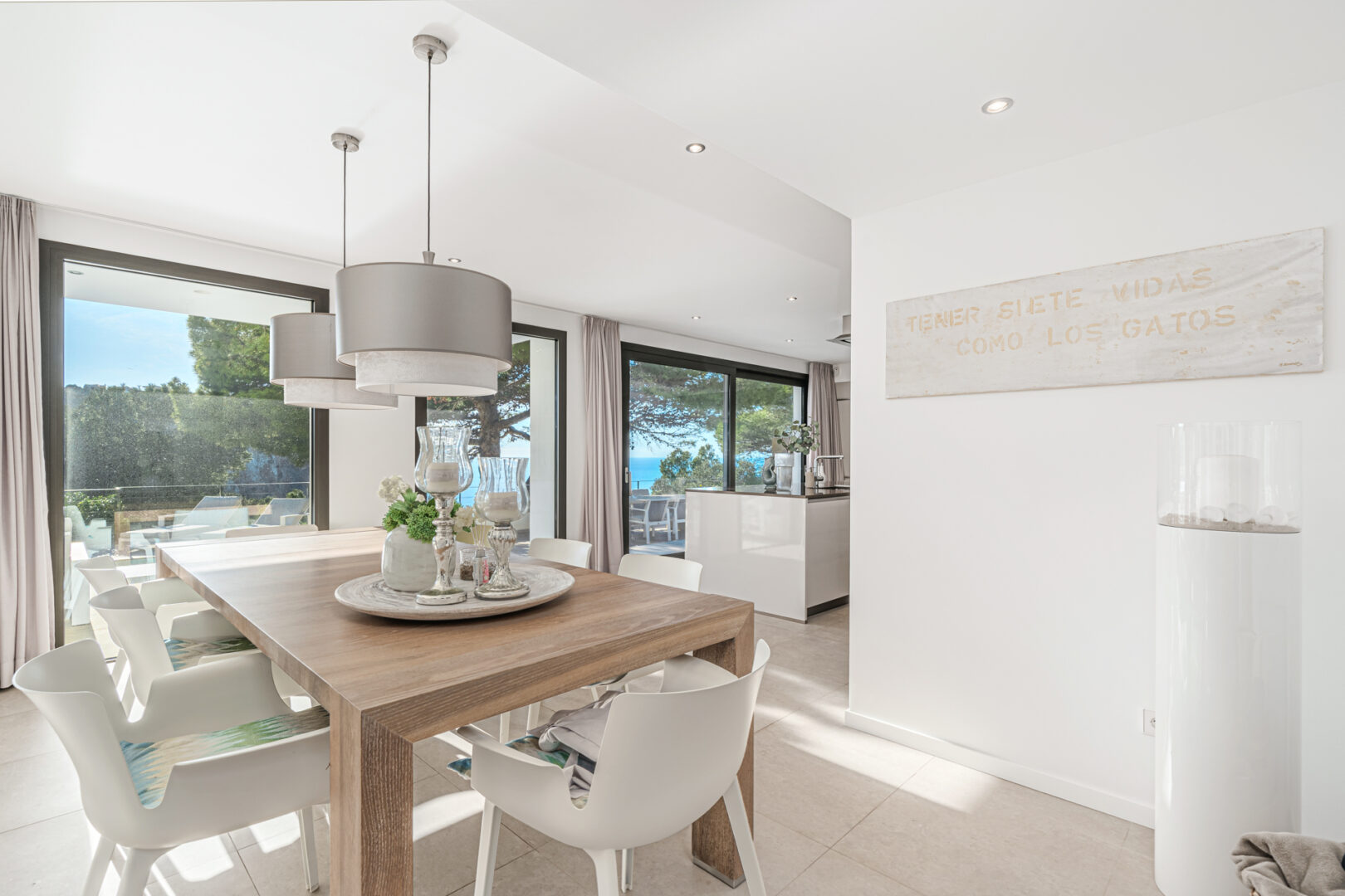 ***EXKLUSIV BEI UNS***Diese exklusive Villa, gelegen auf der Halbinsel La Mola, besticht durch Ihre herausragende Lage und den spektakulären Blick auf das offene Meer. Auf einem 580 m² großen Grundstück wurde die Liegenschaft 2017 kernsaniert und vereint auf stilvolle Weise modernen Luxus mit mediterranem Charme. Der einladende Eingangsbereich führt in das erste Obergeschoss, in dem sich das großzügige Masterschlafzimmer mit unverbaubarem Panoramablick auf das Meer und einem eleganten Bad en-Suite nebst Balkon befindet. Ein weiteres geschmackvoll gestaltetes Schlafzimmer ebenfalls mit Bad en-Suite und privatem Balkon rundet die obere Etage ab. Im Erdgeschoss präsentiert sich der offene Wohn-, Ess- und Kochbereich. Diese lichtdurchflutete Ebene gewährt ebenfalls atemberaubende Blick auf das Mittelmeer. Die großzügige Küche mit Kochinsel fügt sich harmonisch in den Essbereich ein, während der angrenzende Wohnbereich eine perfekte Oase zum Entspannen bietet. Ein weiteres Schlafzimmer mit Bad en-Suite, ein Gäste-WC, ein praktischen Hauswirtschaftsraum und ein charmanter mediterraner Patio vervollständigen diese Etage. Die ca. 200 m² große Terrasse umfasst einen beheizbaren 30 m² großen Pool, zahlreiche Liegeflächen, eine gemütliche Lounge-Ecke sowie einen großzügigen Ess- und Grillbereich. Eine stattliche Pinie sorgt für angenehmen Schatten, während die Süd-/ Südwestausrichtung das ganzen Jahr über Sonne garantiert. Der spektakuläre Sonnenuntergang rundet das Immobilienerlebnis perfekt ab. Im Untergeschoss befinden sich weitere ca. 50 m² große Räumlichkeiten mit Duschbadezimmer und eigener Terrasse, die individuell als Sauna, Fitnessraum oder ähnliches genutzt werden können. Das Anwesen ist mit modernster Haustechnik ausgestattet, darunter Fußbodenheizung, Klimaanlagen, eine Wärmepumpe und eine Alarmanlage. Die ruhige Lage in einer Sackgasse gewährleistet beste Privatsphäre, Ruhe und absolute Erholung.