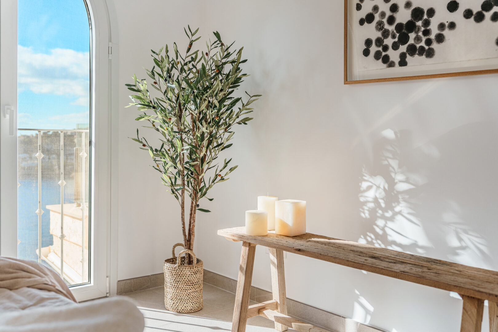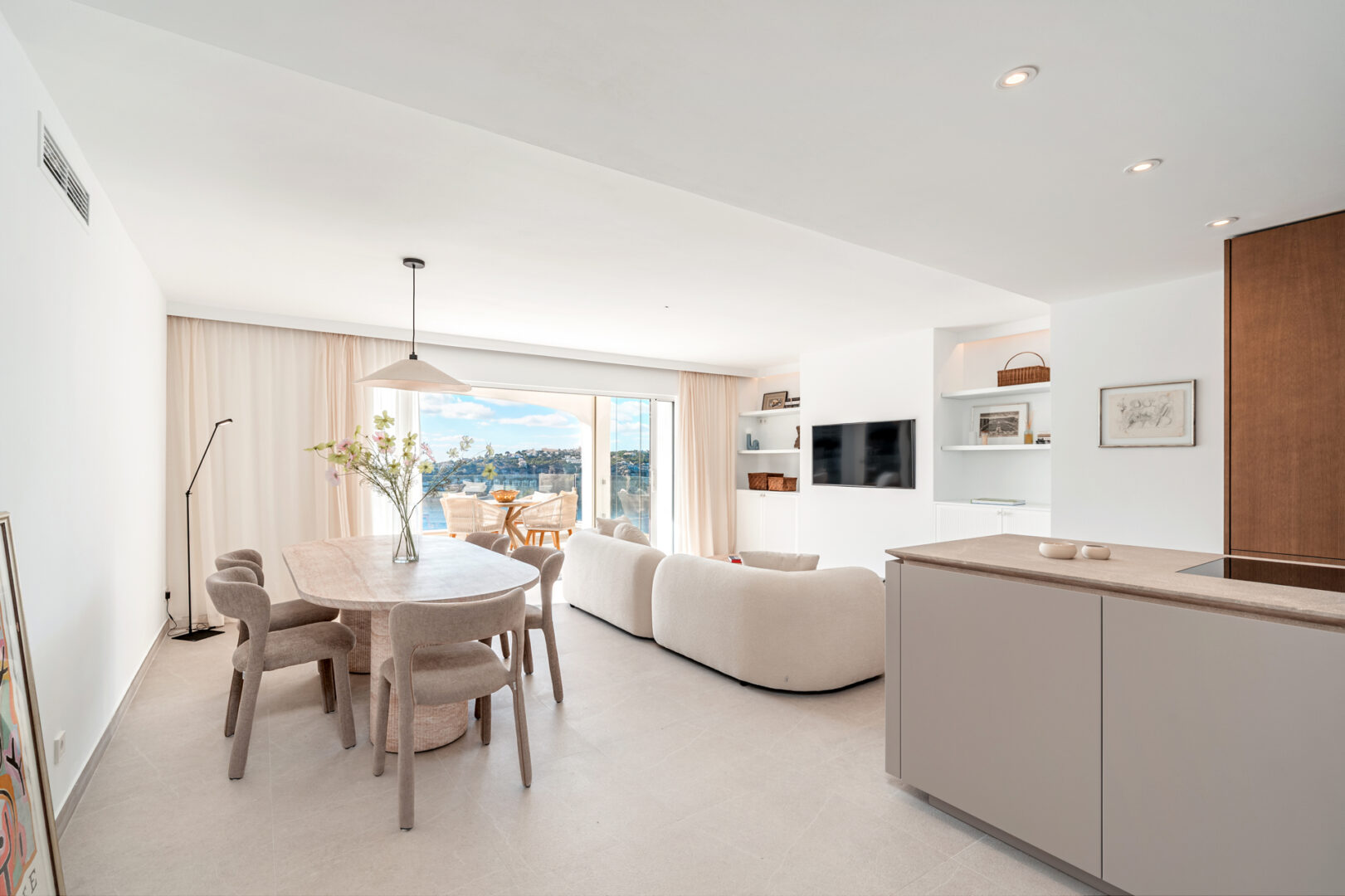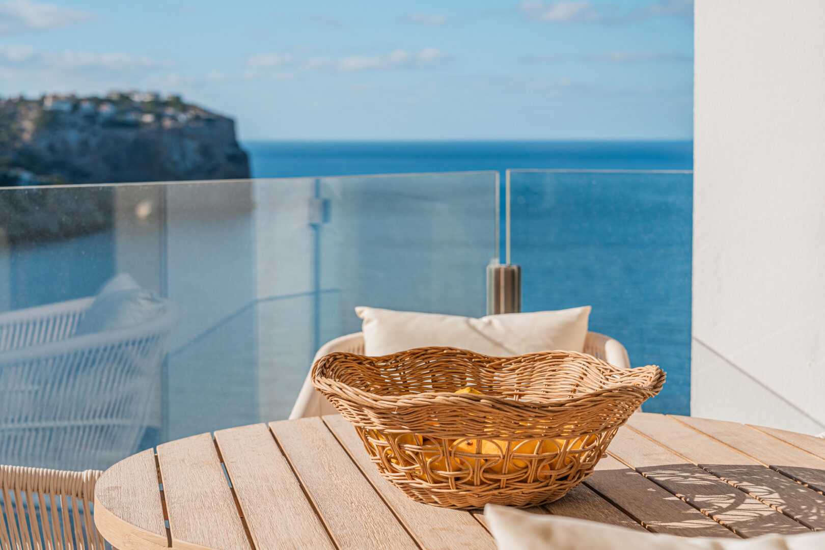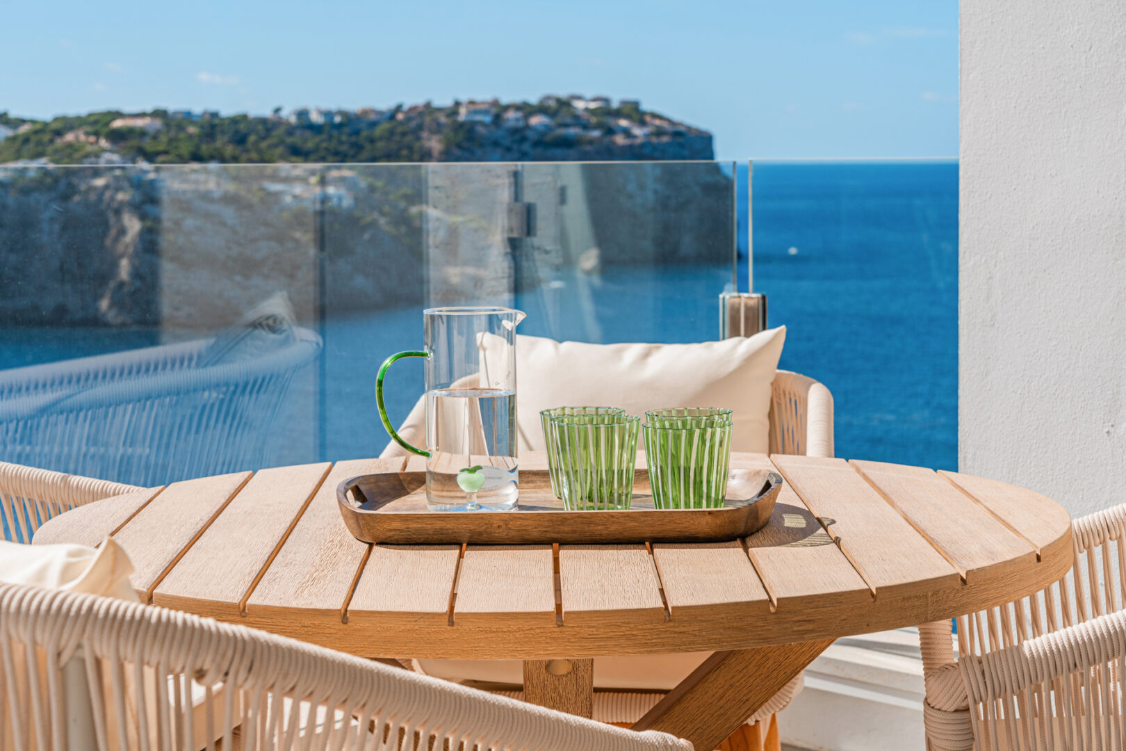Dieses Apartment ist ein wahres Juwel moderner Architektur – vollständig kernsaniert und mit feinsten Materialien ausgestattet. Auf rundum zwei lichtdurchfluteten Zimmern vereint es zeitlose Eleganz mit höchstem Wohnkomfort. Die großzügige Wohnküche ist ein Highlight: eine Designküche von Espacio, ausgestattet mit modernster Technik von Bora und Miele. Bodentiefe Fenster, die nahtlos in der Wand verschwinden, lassen Innen- und Außenbereich verschmelzen und schaffen ein einzigartiges Wohngefühl. Die technische Ausstattung erfüllt höchste Ansprüche: Fußbodenheizung für behagliches Klima, zwei exklusive Badezimmer – eines davon en suite – sowie eine integrierte Waschmaschine machen das Apartment ebenso praktisch wie luxuriös. Die Lage ist unvergleichlich: Der Blick schweift über La Mola, die idyllische Cala Moragues, die Hafeneinfahrt bis hinaus aufs weite Meer. Von morgens bis abends begleitet Sie die Sonne. Komfort steht hier an erster Stelle: Ein Aufzug im Haus garantiert nahe Barrierefreiheit, während die gepflegte Wohnanlage mit ihrem Pool zusätzlichen Mehrwert bietet. Ein rundes Gesamtpaket für alle, die modernes Wohnen, mediterranen Lifestyle und höchste Lebensqualität in exklusiver Lage miteinander verbinden möchten.